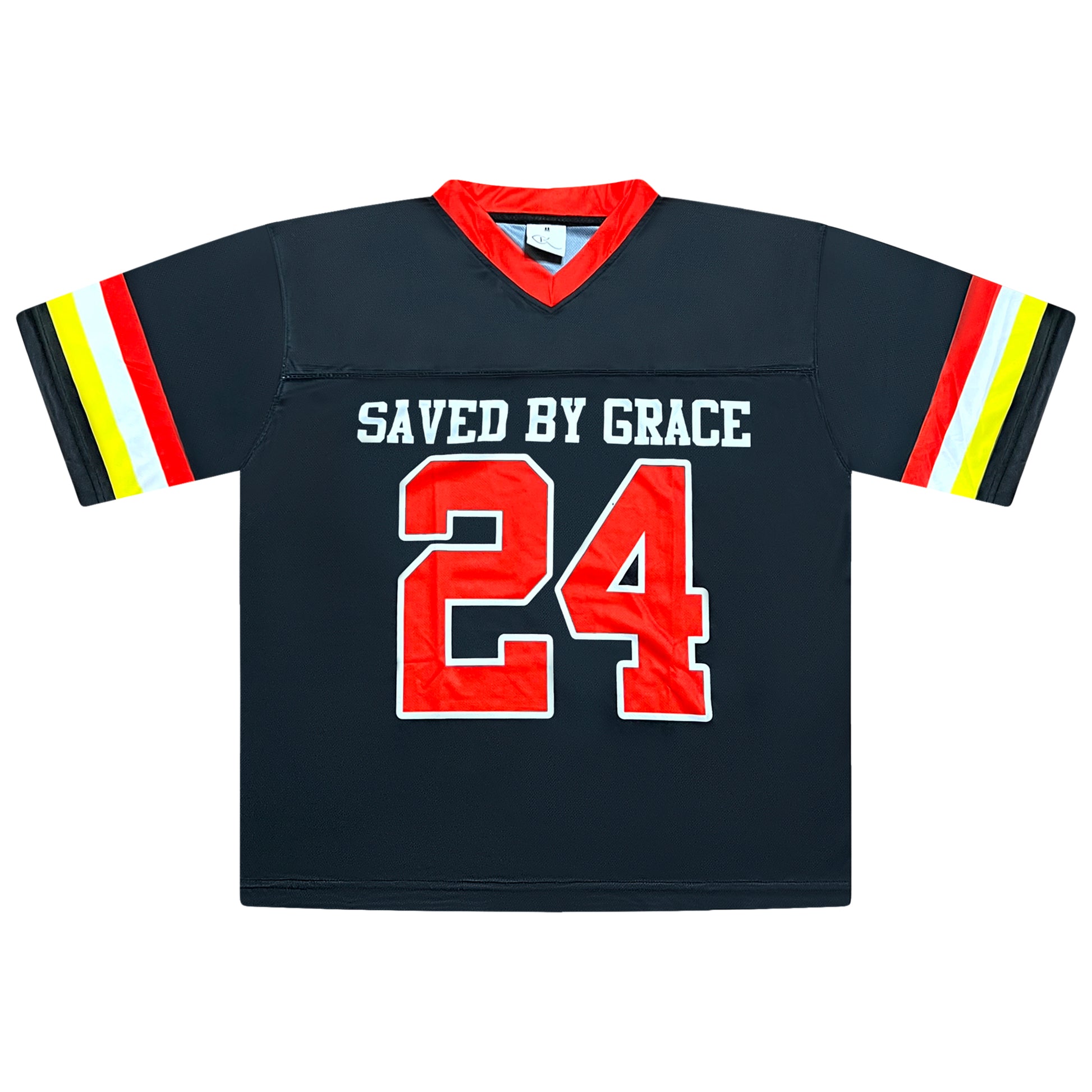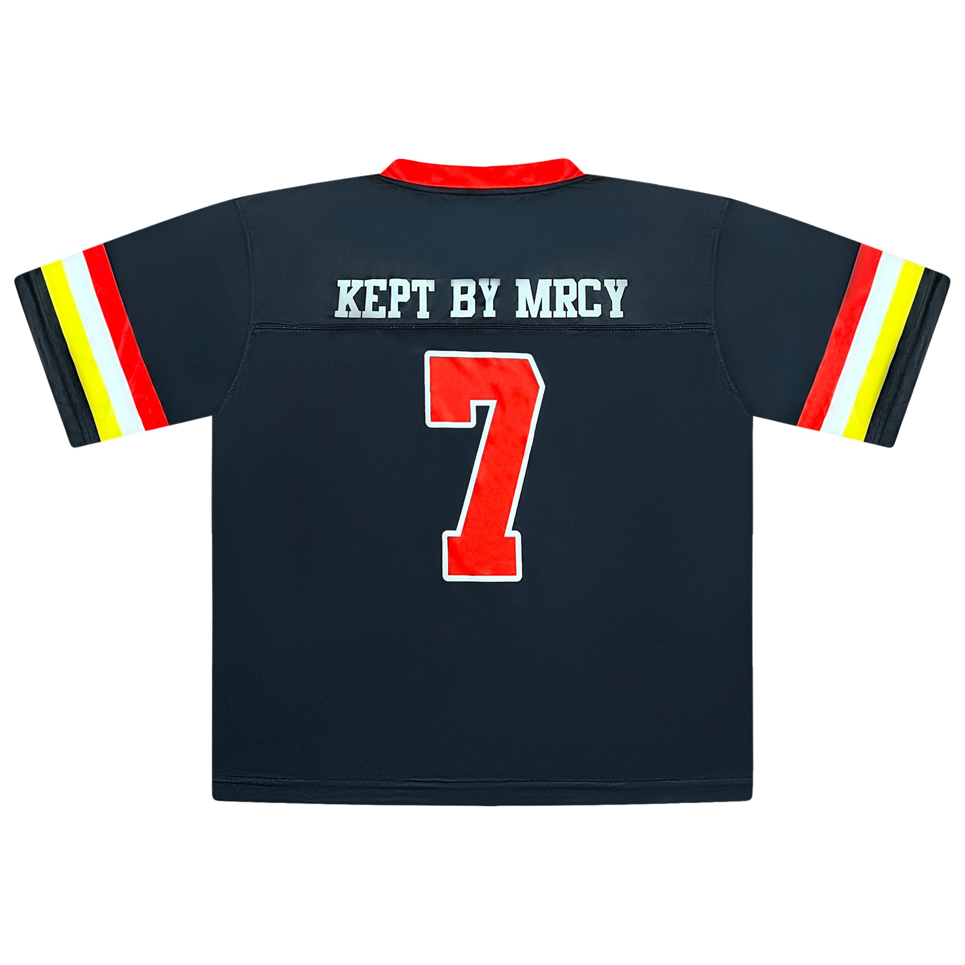 The front reads “Saved by Grace” because that’s where the journey began. The back hits harder with “Kept by MRCY” over the number 7—a divine stamp of completion and proof that what God starts, He finishes.
